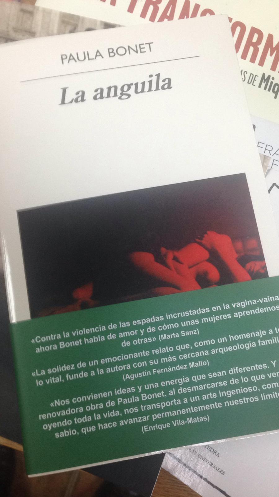 «La anguila» es mi primer Bonet y de su lectura me ha sorprendido cuánta vida puede contener una sola persona. Definitivamente voy con retraso y quizás sea esto lo que hace que uno lea con excitación un libro que tiene en realidad mucho de triste. Se acumulan los sucesos dolorosos en Paula Bonet como si estuviera ella destinada al fracaso y hubiera sido programada por la vida, la madre naturaleza, el gran demiurgo para equivocarse: lo suyo es fatalidad. Quizás su cuerpo como material experimentable para la performance por un dios juguetón -peligrosamente pueril- que manipula, evidentemente, el cuerpo de los demás, el de Paula Bonet en concreto, no el de Marina Abramovic, que ella misma ponía a disposición de morbosos mortales de ambos sexos. En este sentido a Paula Bonet la intervención le viene impuesta, y «La anguila» es una especie de memoria o relato de su violencia sufrida.