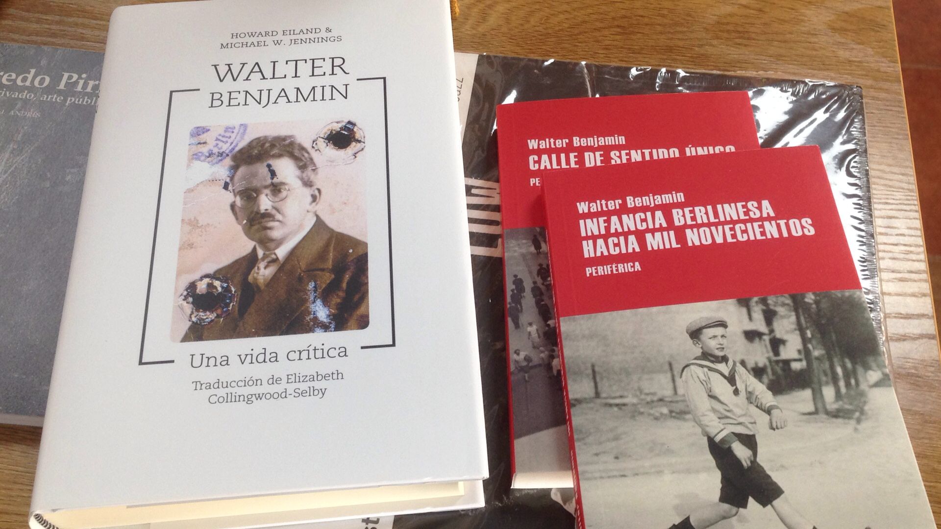 Tres nuevos libros sobre Benjamin 80 años después de su suicidio cuando huía de la necedad fundamentalista y sistematizada. Dos de ellas recogen sus memorias de infancia -traducidas por Richard Gross- en la Serie Menor de la editorial Periférica, en un formato apetecible que se nos antoja a la medida de un pensador cuya obra filosófica y política se construyó con herramientas literarias y con nutrida mirada artística. Además la editorial Tres puntos publicó el año pasado la biografía de Howard Eiland y Michael W. Jennings traducida por Elizabeth Collingwood-Selby. Formato de lujo de más de mil páginas en papel biblia. Nosotros la tenemos ahora después de leer un artículo de Antonio Muñoz Molina. Todas ellas formarán parte de nuestro fondo de librería, sin duda.